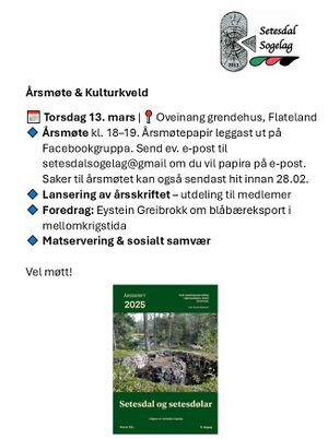 - Årsmøte og kulturkveld i Setesdal Sogelag i Oveinang grendehus på Flateland i Valle klokka 18–20. Lansering av årsskriftet. Foredrag ved Eystein Greibrokk om blåbæreksport i mellomkrigstida. Matservering og sosialt samvær