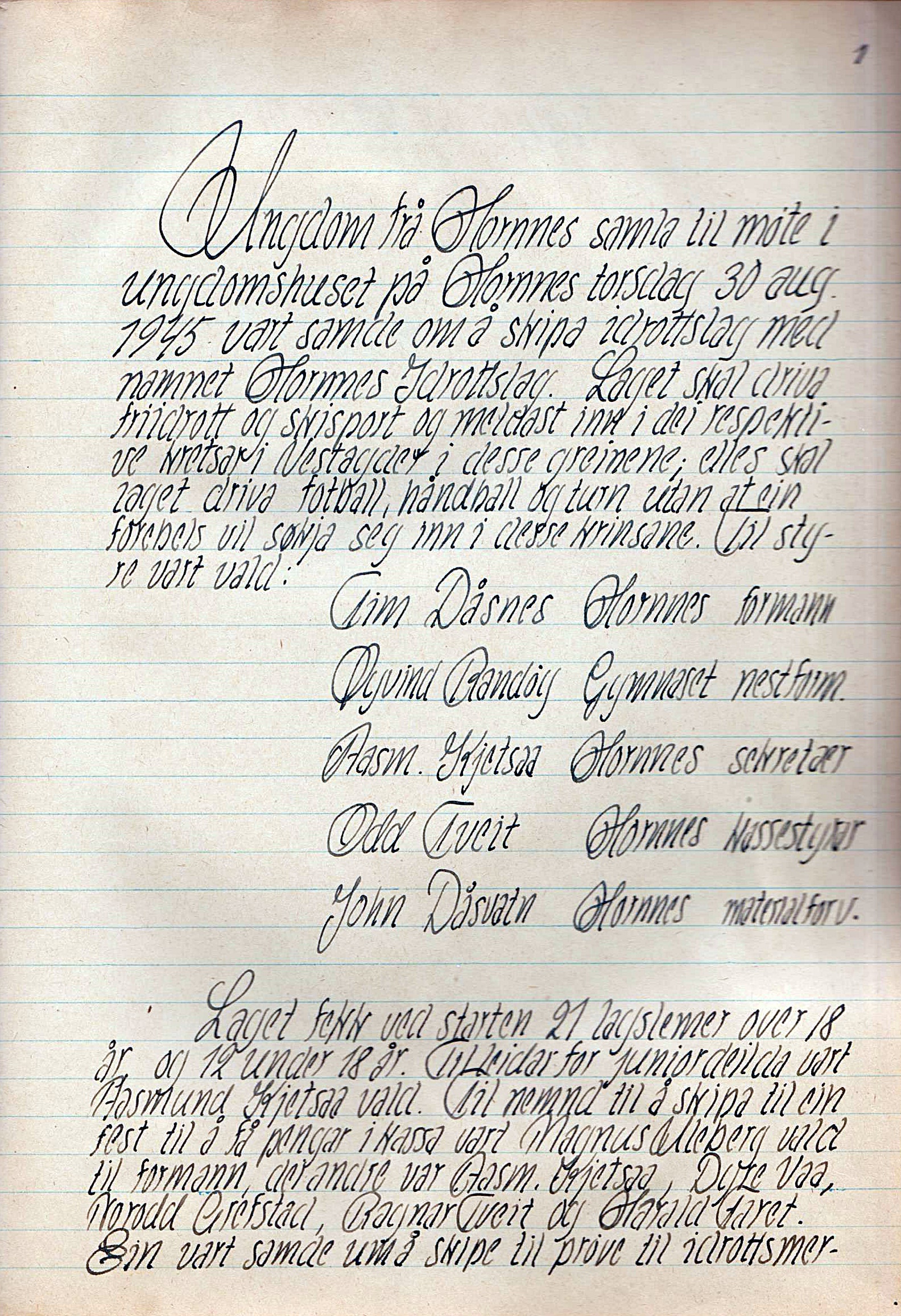 Side 1 i møteboka frå stiftingsmøtet i Hornnes idrettslag 30. august 1945.