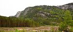 Det stupbratte Linddalsfjellet litt til venstre i biletet.