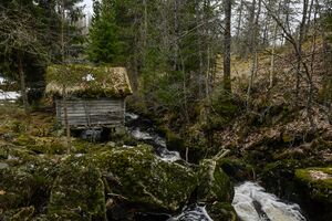 Langs bekken, på Nedre Ljosland, står eit gamalt kvernhus.