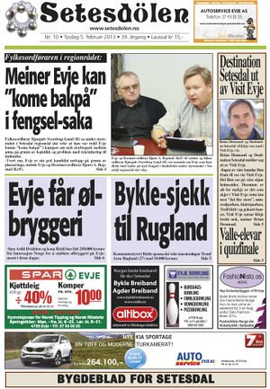 Setesdølen nr. 10, 2013 kom ut tysdag 5. februar 2013. Setesdølen hadde 12 sider denne dagen.