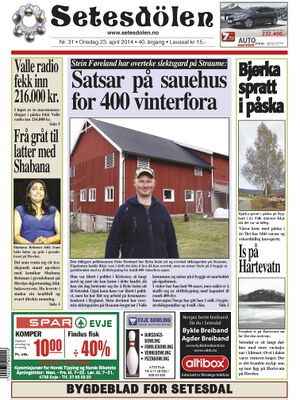 Setesdølen nr. 31, 2014 kom ut onsdag 23. april 2014. Setesdølen hadde 12 sider denne dagen.