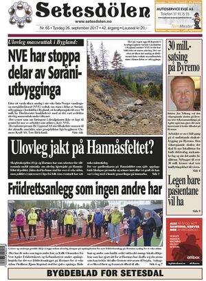 Setesdølen nr. 65, 2017 kom ut tysdag 26. september 2017. Setesdølen hadde 12 sider denne dagen.