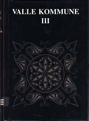 Valle kommune III Gards- og ættesoge Valle er tredje band i gards- og ættesoga for Valle. Boka omhandlar gardane på aust- og vestsida av Otra frå Flårenden til Nomeland. Forfattar er Alfred Ryningen. Boka kom ut i 1987. Utgjevar er Valle kommune. Ho er trykka av Reklametrykk Grafisk AS, Bergen. 690 sider.