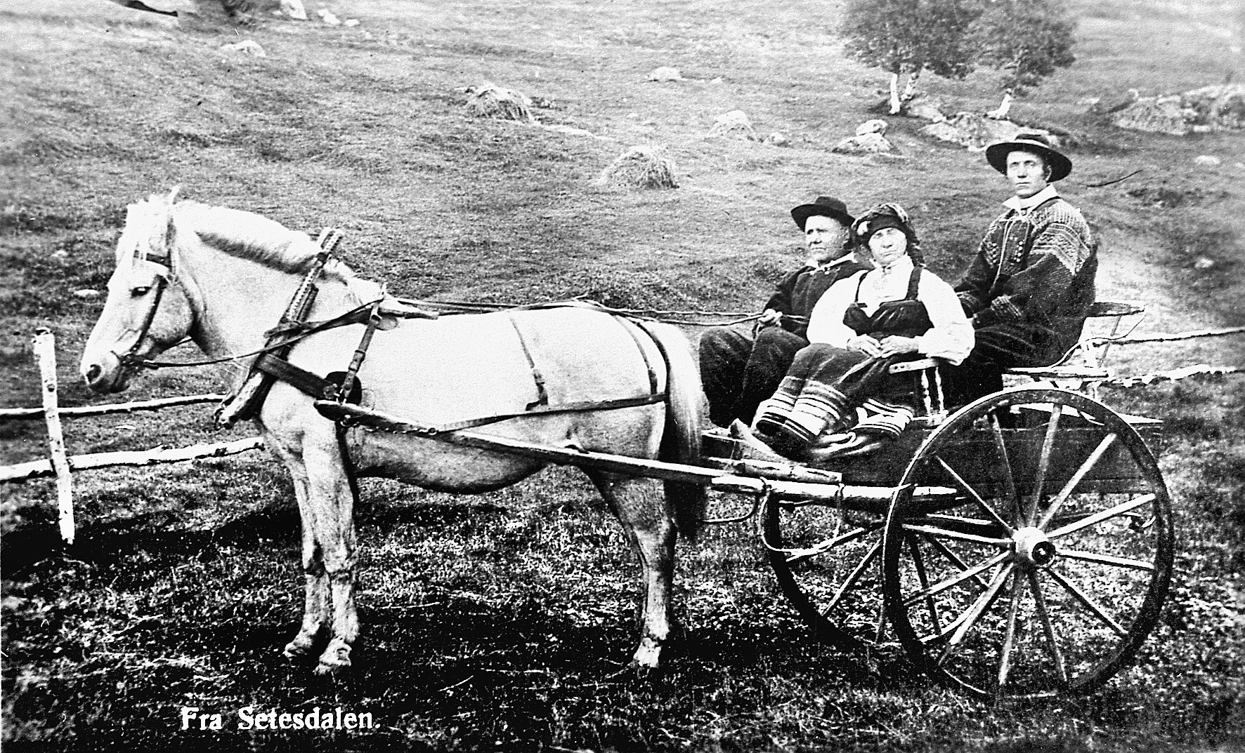 Anlaug Olsdotter Tveiten med mannen Tarjei Eivindsson Sanden. Køyrekaren er sonen Eivind Tarjeisson. Paret budde på Sanden, også kalla Eidsvollsbakken, i Bykle (gnr. 16/9 på Stavenes). Foto: Ferdinand Køhn, 1910. Biletet ligg hos Setesdalsmuseet, og vart trykt i Heimar og folk i Bykle (2006).