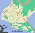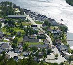 Strandgata går mellom Riksveg 9, som er nærast og Senumsundet i bakgrunnen til venstre.