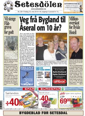 Setesdølen nr. 38, 2014 kom ut fredag 16. mai 2014. Setesdølen hadde 20 sider denne dagen.