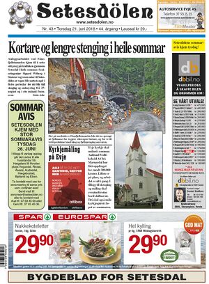 Setesdølen nr. 43, 2018 kom ut torsdag 21. juni 2018. Setesdølen hadde 12 sider denne dagen.