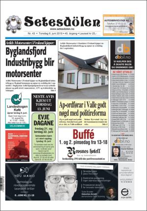 Setesdølen nr. 43, 2019 kom ut torsdag 6. juni 2019. Setesdølen hadde 16 sider denne dagen.
