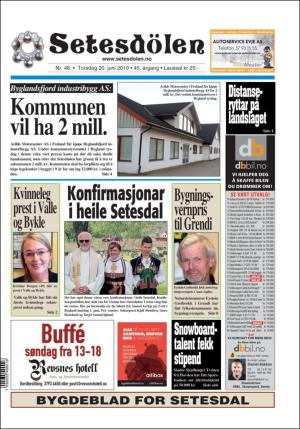 Setesdølen nr. 46, 2019 kom ut torsdag 20. juni 2019. Setesdølen hadde 12 sider denne dagen.