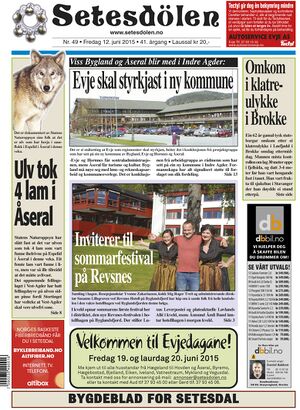 Setesdølen nr. 49, 2015 kom ut fredag 12. juni 2015. Setesdølen hadde 16 sider denne dagen.