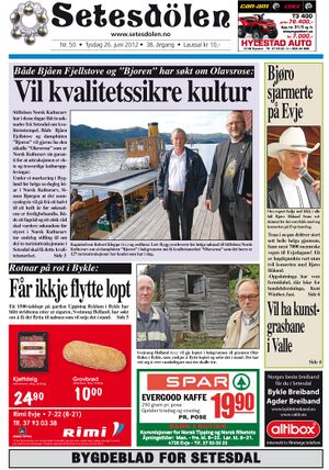 Setesdølen nr. 50, 2012 kom ut tysdag 26. juni 2012. Setesdølen hadde 12 sider denne dagen.