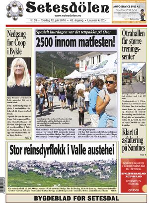 Setesdølen nr. 53, 2016 kom ut tysdag 12. juli 2016. Setesdølen hadde 12 sider denne dagen.