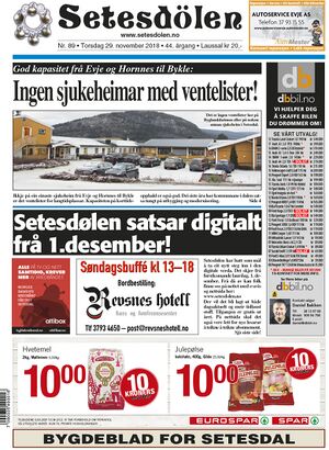 Setesdølen nr. 89, 2018 kom ut torsdag 29. november 2018. Setesdølen hadde 12 sider denne dagen.