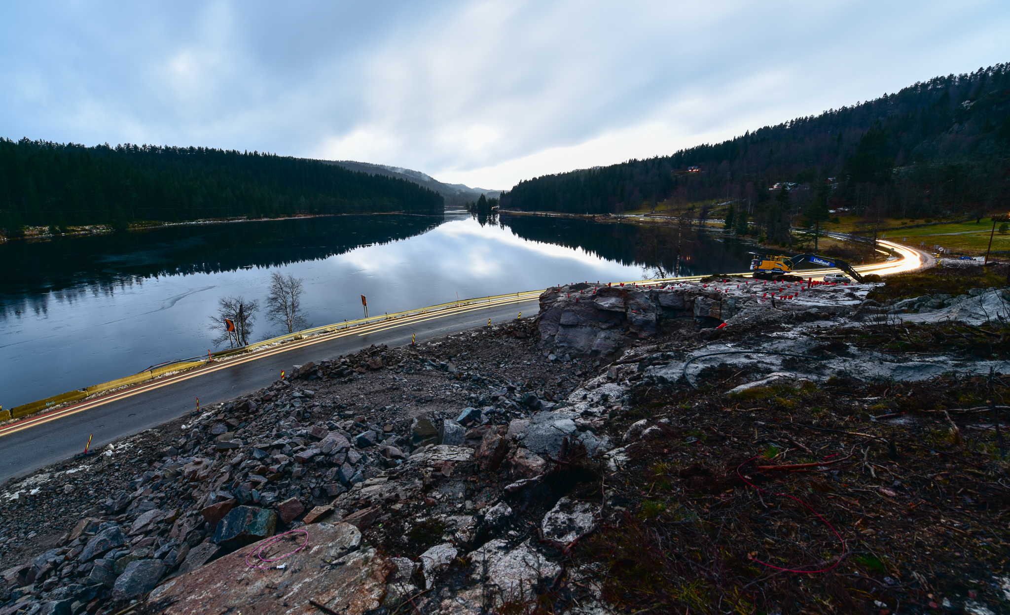 Vegarbeid på Fylkesveg 42 (Arendalsvegen) ved Lislevatn i Evje 30. november 2018.