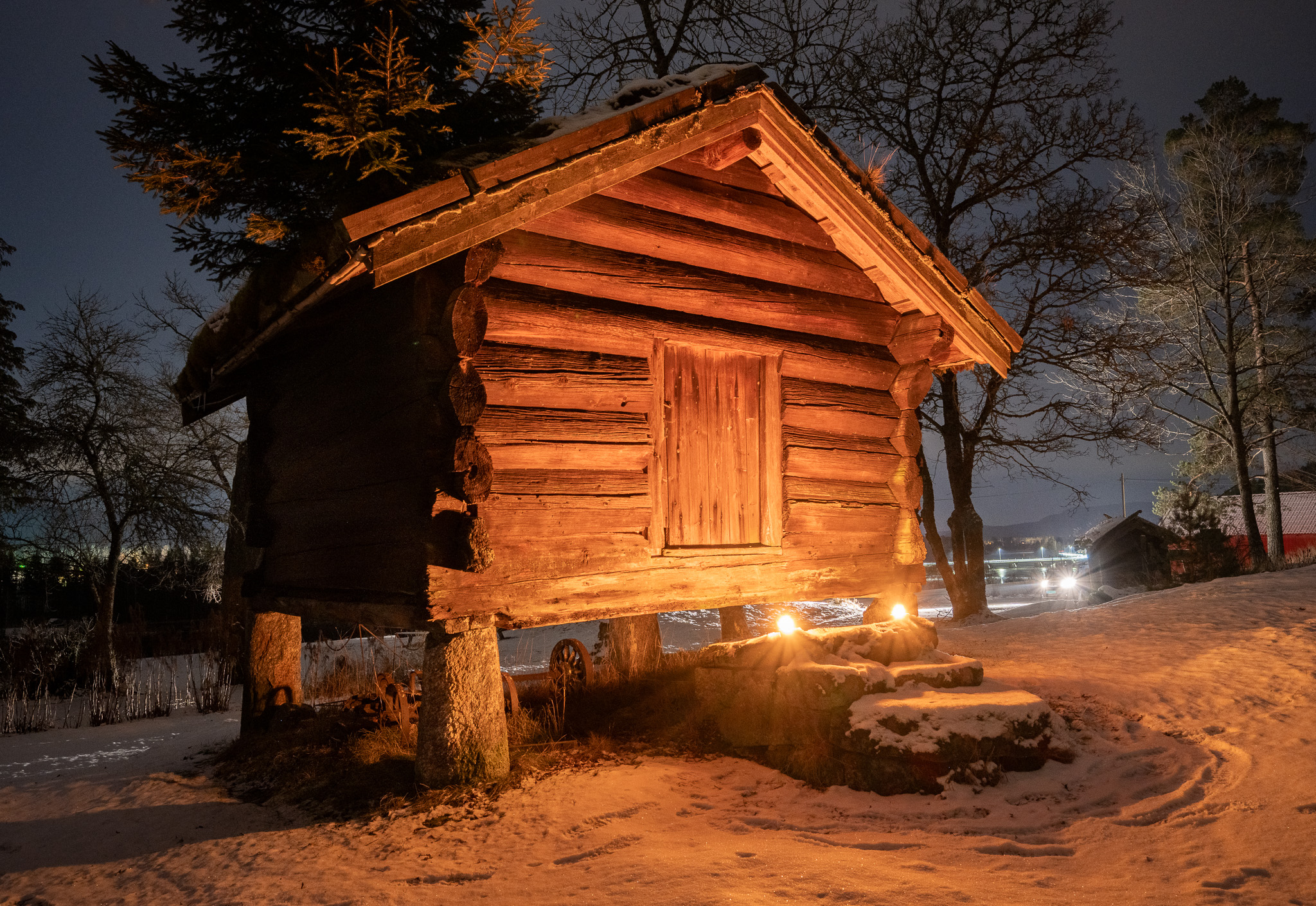 Stolpehus på Evje og Hornnes museum, Fennefoss om kvelden 5. januar 2025.