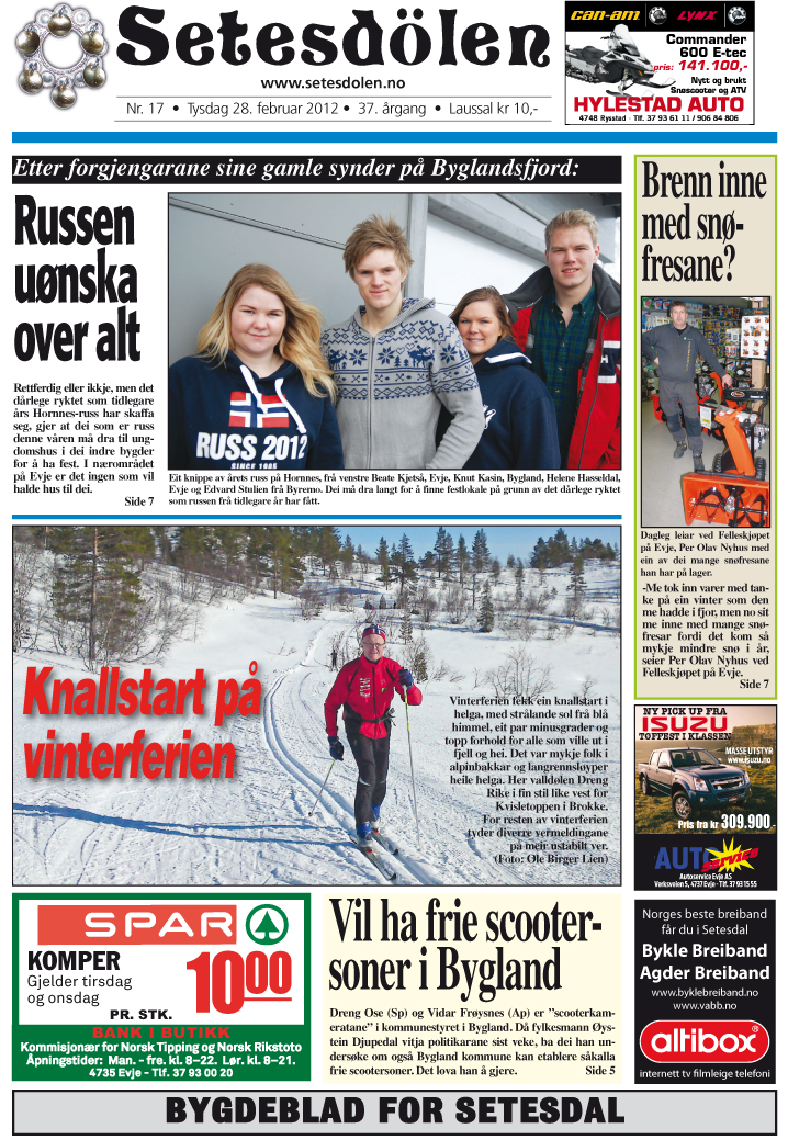 | gjeldande | 28. februar 2012 kl. 19:14 | 718 × 1 039 (771 KB) | Harald Haugland (diskusjon | bidrag) | Etter avtale med Sigurd Haugsgjerd Kategori:Setesdølens forsider 2012 |
