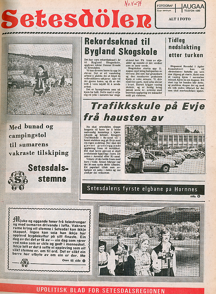 Framsida av setesdølen nr. 4, 1974. Etter avtale med red. Sigurd Haugsgjerd.