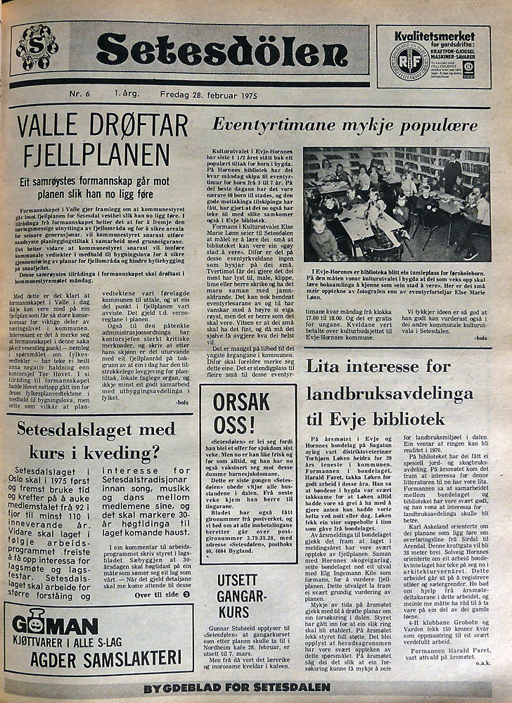 Framsida av Setesdølen nr. 6, 28. februar 1975. Etter avtale med red. Sigurd Haugsgjerd.