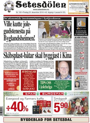 Setesdølen nr. 100, 2016 kom ut fredag 23. desember 2016. Setesdølen hadde 24. sider denne dagen.