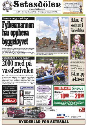 Setesdølen nr. 51, 2013 kom ut tysdag 2. juli 2013. Setesdølen hadde 12 sider denne dagen.