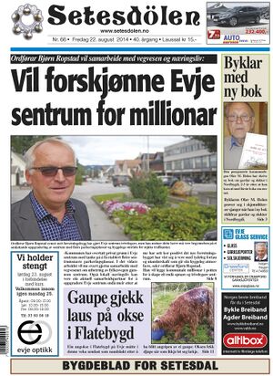 Setesdølen nr. 66, 2014 kom ut fredag 22. august 2014. Setesdølen hadde 16 sider denne dagen.